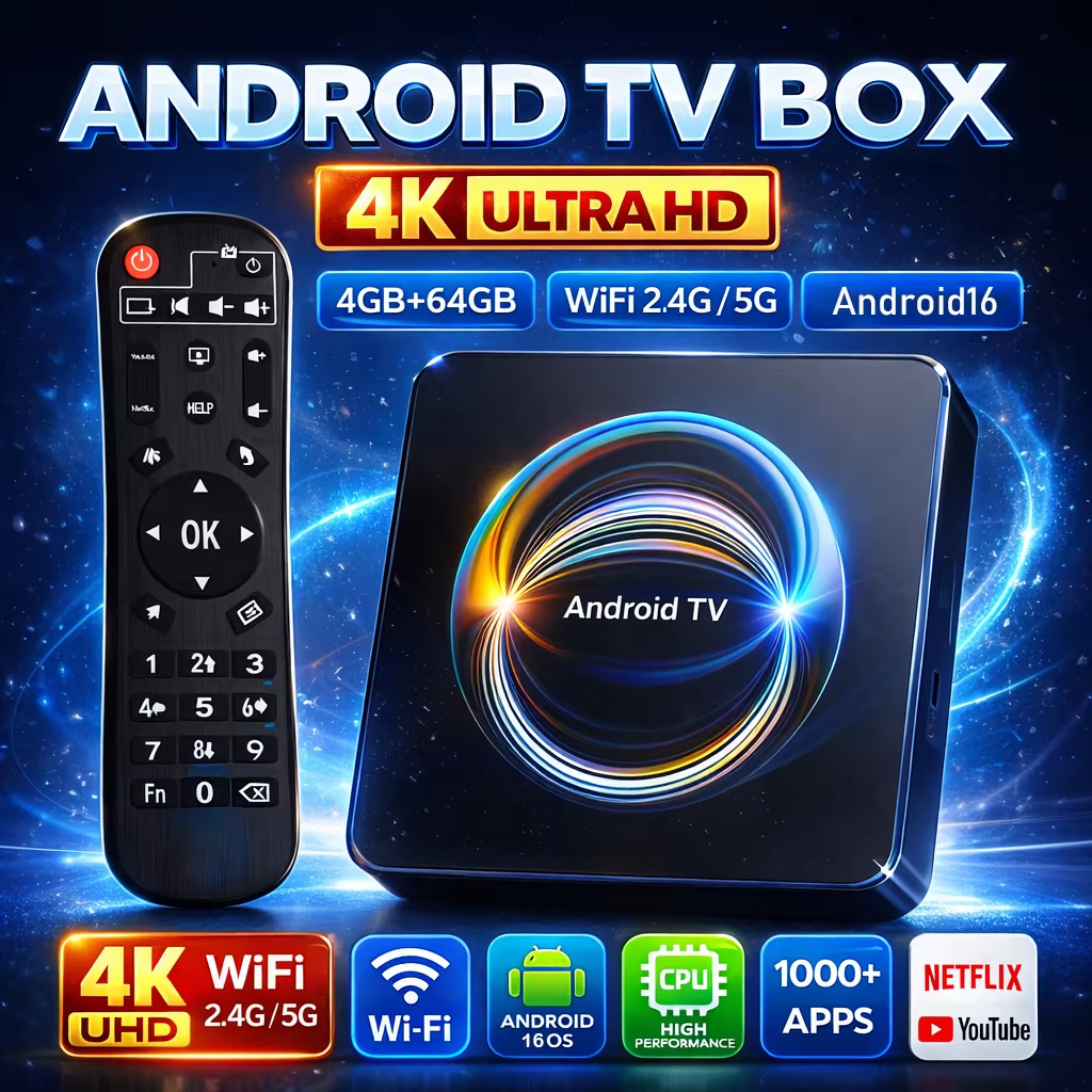 Das Bild vermittelt eine leistungsstarke, moderne und vielseitige Android TV Box, die sich ideal für 4K-Streaming, Apps, Online-Inhalte und Smart-TV-Erlebnisse eignet. Die Kombination aus kräftigen Farben, klaren Symbolen und technischer Darstellung zielt klar auf ein technikaffines Publikum und einen hohen Qualitätsanspruch ab.